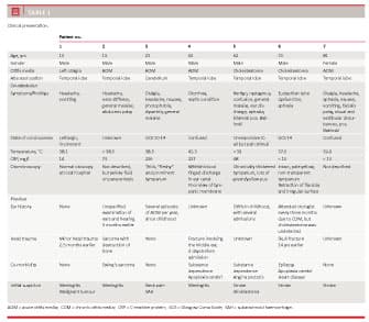 The patients presented with diffuse clinical symptoms and signs such as general malaise, altered state of consciousness, headache, aphasia and vestibular impairment and various focal neurological deficits, and the time from first admission to correct diagnosis ranged from days to several weeks (Table 1). Confusion, aphasia and vestibular impairment were more prominent in the elderly patients (62-81 years). In the young patients