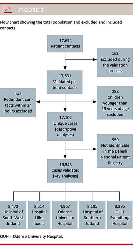 is not possible to separate cases of readmission within 24 hours. Likewise, children younger than 15 years of age (n = 288) (the diagnostic packages were not designed for children) were excluded, leaving a sample of 17,102 cases for descriptive analysis. Of these, 16,543 (96.7%) were identified in the Danish National Patient Registry, enabling validation for the key analyses concerning co-morbidity and association between assignments to diagnostic packages and discharge diagnoses (Figure 2).