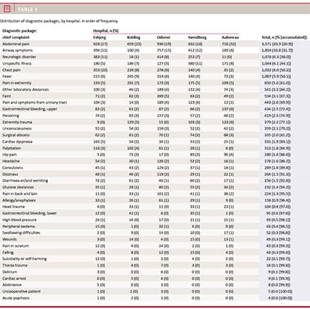 Abdominal pain was the most frequently assigned diagnostic package (21%), followed by airway symptoms (11%), neurologic disorder and chest pain (both 6%). Our findings hence partly corroborate those of an American study in which abdominal pain, chest pain and breathing difficulties were among the five most commonly coded chief complaints [12]. Furthermore, in a Finnish study classifying 89 complaint categories, the authors found that 7.6% concerned abdominal pain, 3.7% chest pain and 4.9% airway symptoms [13]; a Danish study assessing the pathway of 9,863 acute patients showed that 20% were assigned to packages for abdominal pain, 6% for chest pain and 7% for airway symptoms [7]. Others [14] found a 86% correlation between discharge diagnoses and medical assessment practice in a Scandinavian material. Thus, our result may represent an underestimation.