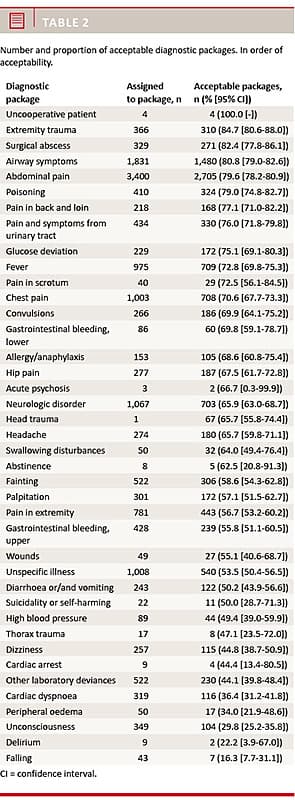 A total of 68% of the included patients had been assigned an acceptable diagnostic package (95% CI: 67.2-68.7). We found appropriate use of packages in more than 50% of cases in 30 diagnostic packages (Table 2). The analysis of the appropriateness of the diagnostic packages assigned found a 100% fit for the package uncooperative patient; however, this was used only four times. Among the more frequently used packages, appropriate choices were made in 84.7% of extremity trauma cases (n = 366), 82.4% of surgical abscess (n = 329) cases and 80.8% of airway symptom (n = 1,831) cases.