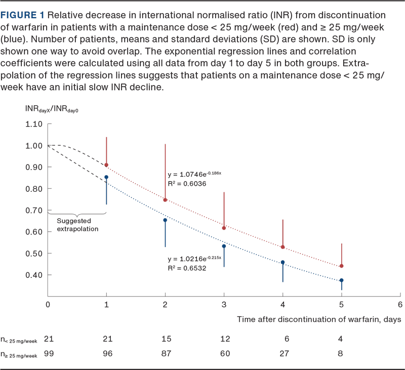 We found that the initial decrease in INR after discontinuation of warfarin was significantly slower from day 0 to day 1 in patients with a maintenance dose < 25 mg/week than in patients with a higher maintenance dose. After day 1, INR decreased exponentially with parallel-spaced regression lines for patients with maintenance doses ≥ 25 mg/week and < 25 mg/week. None of our patients had a maintenance dose < 10 mg/week. In patients with a very low maintenance dose, an even longer period of slow decline in the initial INR is likely. Further studies are warranted on the INR during pre-interventional warfarin interruption in patients with a low warfarin maintenance dose, as these patients are particularly at risk of having a target INR that is higher than planned.