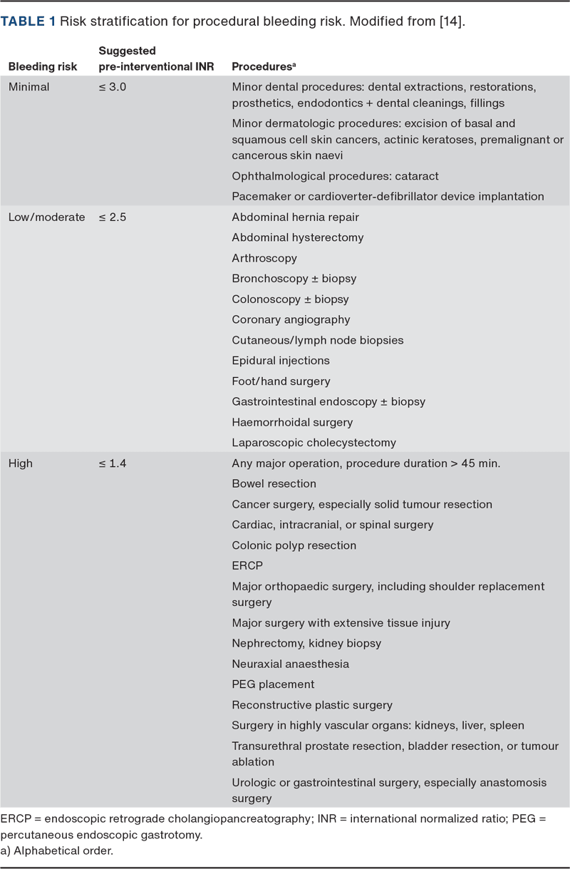 Although warfarin has been used for decades, pre-interventional downregulation of the international normalised ratio (INR) still causes problems [1]. The decrease in INR after pausing warfarin typically takes longer in those with an initial high INR and patients on a low maintenance dose due to factors such as advanced age, decompensated congestive heart failure, active malignancy, CYP2C9 and VKORC1 genotype or interacting comedication [2-6]. One way to overcome the uncertainty as to the rate of decline in INR is to discontinue warfarin for a week or more preoperatively. However, long-term warfarin interruption exposes patients to an unnecessarily high risk of thromboembolic events [7]. Heparin bridging has been proposed to reduce the risk of thrombosis. However, cohort studies, randomised trials and meta-analyses have shown that heparin bridging increases the perioperative incidence of major bleeding without reducing the risk of thrombosis [8, 9].