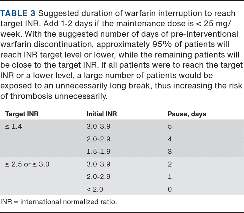 Tables S2 and S3 in the online-only data supplement show a count of when the patients reached the target INR based on the baseline INR and the planned target INR. Based on these tables, we revised our estimate of when the target INR is likely to be achieved. All seven patients with a target INR ≤ 3.0 were already at the desired INR level from day 0. Table 3 shows our suggestions for individualised duration of pre-interventional warfarin interruption based on the maintenance dose, the initial INR and the planned target INR.