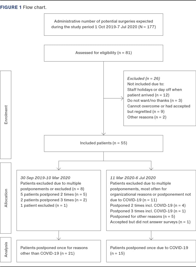 A total of 177 cardiac surgeries were expected to be performed in the hospital between 1 October 2019 and 7 July 2020. Among these, 81 (46%) patients experienced postponement of their elective surgery (Figure 1), and a total of 55 patients were eligible for inclusion in this study. However, some patients experienced additional postponements, leaving 21 patients for evaluation in group 1 and 15 patients in group 2. All patients in group 2 participated in interviews conducted 118-186 days post-operatively, except one (287 days). The interviews produced 105 standard pages of transcribed interviews. Here, only findings regarding patients’ expressions of psychological distress when postponed during the COVID-19 pandemic are presented.