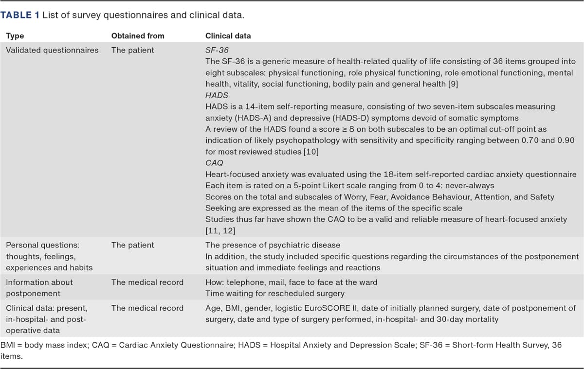 The study was based on both quantitative (survey and clinical) and qualitative (interview) data. The survey consisted of validated questionnaires regarding anxiety and depression (the Hospital Anxiety and Depression Scale (HADS)), quality of life (Short-form Health Survey, 36 items (SF-36)) and heart-focused anxiety (Cardiac Anxiety Questionnaire (CAQ)), questions on sociodemographic and clinical information, and ad hoc questions regarding the patient’s feelings when his or her surgery was postponed (Table 1).