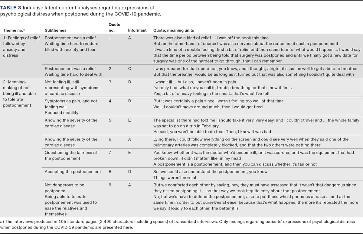 Some expressed unawareness of critical symptoms of cardiac disease (Quote 3, Table 3), whereas those feeling more seriously ill had been told so by external cardiac experts or had the longest history of cardiac disease (Quote 5-6, Table 3). These patients expressed doubts relating to their postponement, and one did not find COVID-19 to be a more acceptable reason for postponement than any other reason (Quote 7, Table 3). For the rest of the patients, postponement due to COVID-19 was a circumstance they had to accept (Quote 8, Table 3), and it seemed reasonable as hospitalisation during the pandemic seemed unsafe.