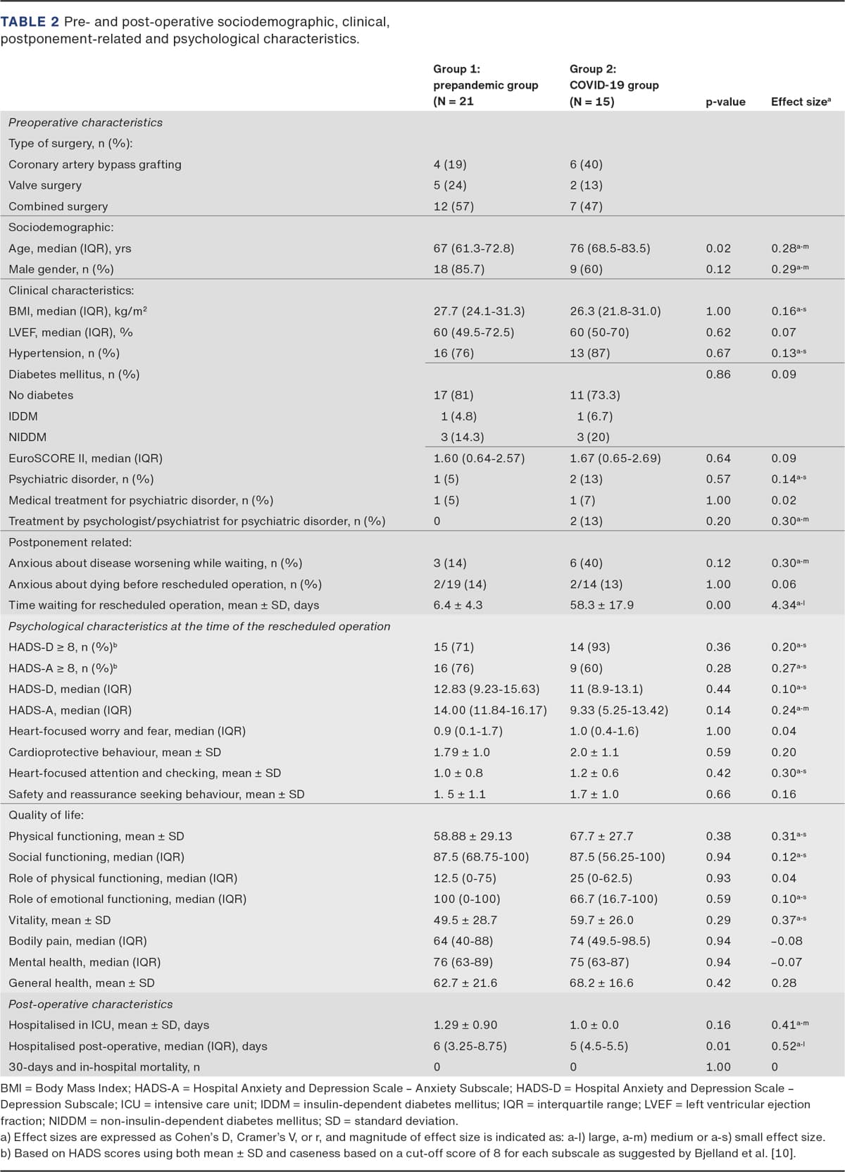 The study sample is a subsample of a larger study on postponements. Hence, a priori power calculation was not possible as the pandemic determined the sample size in both groups. Consequently, the sample size is limited, and therefore we also used effect sizes (Table 2) to evaluate whether the lack of significant results may be due to a lack of power.