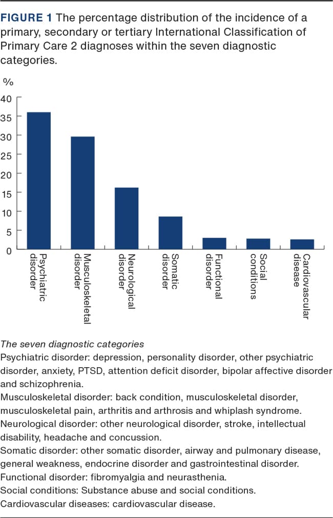 The significance of a diagnosis as a prognostic factor was investigated in a Swedish study using the ICD-10 to determine the effect of the diagnoses on return to the labour market for 600,000 individuals [6]. The study concluded that a diagnosis is a good predictor of long-term sick leave, but that that more detailed research is warranted. In the present study, 743 diagnoses were made by a primary care professional who had significant knowledge about the individuals from an interview with the person and from access to case notes with medical and social information. The results show that the diagnoses of back conditions and musculoskeletal disorders are the most common reasons for sick leave. By combining the different diagnostic categories shown in Figure 1, psychiatric disorders appear as the group accounting for the largest percentage of long-term sick leaves.