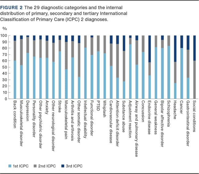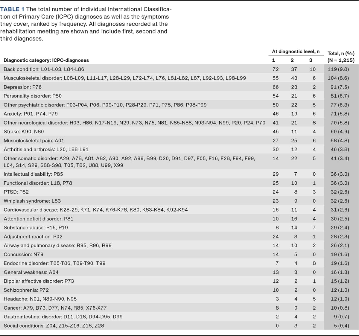 We chose to use the ICPC-2 classification system in this study because the structure of multidisciplinary rehabilitation meetings resembles a consultation in primary care and because the municipalities and departments of community medicine work closely together with general practitioners allowing information to be exchanged more easily. It was determined that the ICPC classification was the correct diagnostic system to use in this context owing to the thorough preliminary work that was conducted and the six instructions provided in the manual. This is supported by the results of the chi-squared test, which showed no significant difference in the number of secondary and tertiary diagnoses made by the five participating doctors.