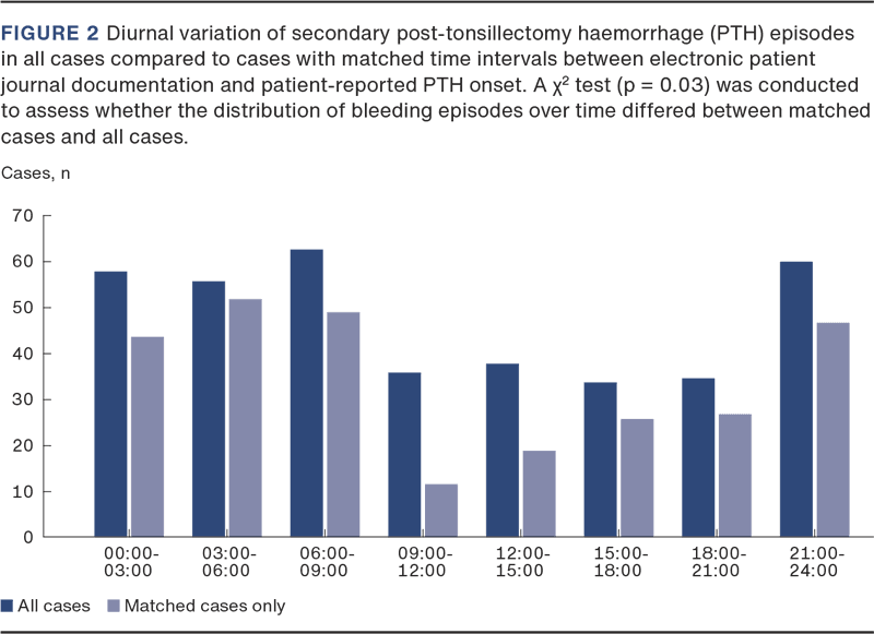 Patient-reported bleeding times matched the EPJ records in 76% of cases. In 17% of cases, patients reported a different onset time; in 7%, data were unachievable. The sensitivity analysis, however, showed a difference in diurnal patterns between matched cases and the full cohort (χ² = 15.52, p = 0.030) (Figure 2).