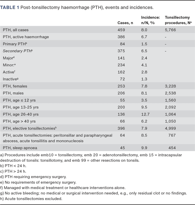 By indication, haemorrhage rates were 7.9% (elective), 8.5% (acute) and 9.9% (OSA) (Table 1). Acute cases showed higher secondary (8.1%) and major PTH (3.7%) rates, whereas primary PTH was more common in OSA (3.3%). Only eight PTH events due to tonsillotomies were registered - two resulting in major PTH.