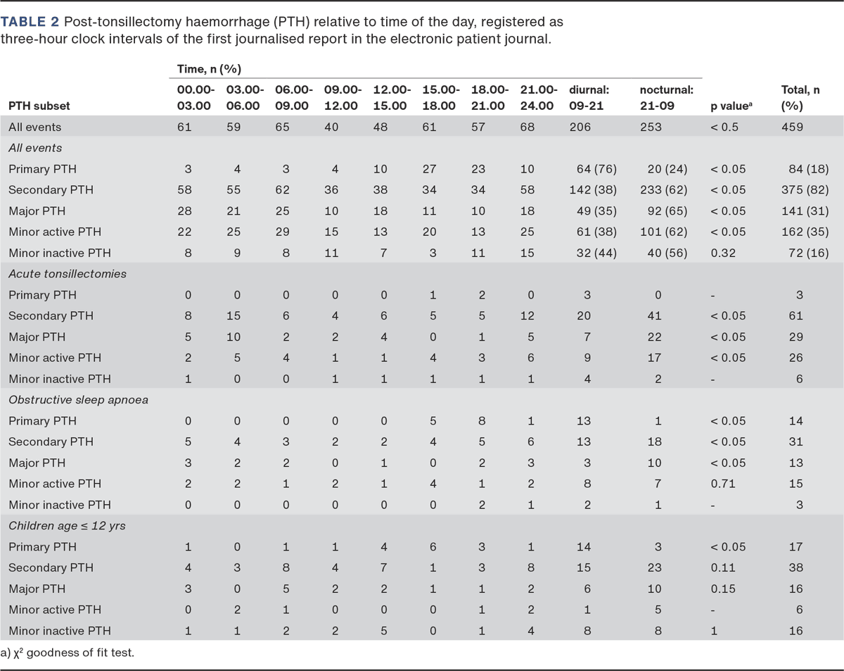 The primary outcome was determining the time of day when the PTH event was recorded in the EPJ. Whenever achievable, this was cross-checked against the patient-reported time of PTH onset as documented in the EPJ. Time intervals were categorised into three-hour slots (00:00-03:00, 03:00-06:00, 06:00-09:00, 09:00-12:00, 12:00-15:00, 15:00-18:00, 18:00-21:00, and 21:00-00:00). PTH events were classified as either primary (≤ 24 hours) or secondary (> 24 hours). Secondary PTH was further stratified into four distinct subgroups: 1) Major PTH, PTH requiring ES for surgical haemostasis. 2) Minor active PTH, comprising PTH managed with medical treatment or other healthcare interventions. 3) Minor inactive PTH, denoting PTH instances with no medical or surgical intervention (e.g., only residual clot or no findings), and finally 4) Minor recurrent PTH, referring to patients with multiple healthcare encounters due to repeated bleeding episodes. This category was subsequently reclassified based on the first PTH event and included in the data of the most representative subgroup, whereas recurrent PTH involving ES at any time was classified as major PTH.