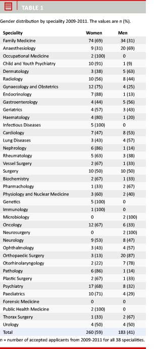 In 2009-2011, 41% of the recruited young doctors were men and 59% were women. In 64% of the specialities, the majority of those accepted were women. This did not change between 2009 and 2011 (Table 1).