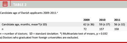 The average biological age of doctors recruited for residency training in 2009-2011 was 35 years and the average candidate age was 70 months. Graduates from universities outside Denmark had a higher candidate age than doctors graduating from Danish universities. If the 56 foreign graduates were excluded from the data, the average biological age was 34 and average candidate age was 58 months. 87% of the applicants graduated before the summer of 2008.
