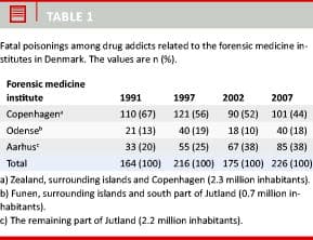 The study included all fatal poisonings among drug addicts in 2007 (n = 226), examined at the three forensic medicine institutes in Copenhagen (Zealand, surrounding islands, and Bornholm), Aarhus (Jutland, excluding Southern Jutland), and Odense (Funen, surrounding islands, and Southern Jutland). The same definition of a drug addict was used in this study as in the common Nordic studies: "a person who according to information from the police and/or autopsy report is known to have abused drugs intravenously and/or abused drugs listed in the Single Convention on Narcotic drugs 1961, schedule I (heroin, morphine, ketobemidone, cocaine, etc.), and/or the International Convention on Psychotropic Substances 1971, schedules I and II (amphetamine, LSD, etc.)".