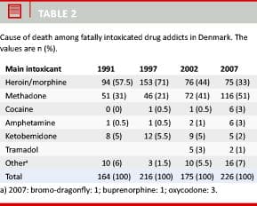 Steentoft A, Kringsholm B, Hansen AC et al. Forgiftningsdødsfald blandt narkomaner i Danmark i 2002. Ugeskr Læger 2005;167:1954-7.