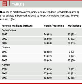 In conclusion, this study shows considerable changes in abuse patterns and trends first observed in 2002 have continued. Methadone is now the most frequent cause of death. Fatal heroin/morphine intoxications have continued to decrease, while the increase in methadone seems to compensate for this. Cocaine and amphetamine constitute a considerable number of fatal poisonings; whereas these drugs were negligible in earlier studies. Large differences were detected between the different parts of Denmark; therefore, a follow-up study is strongly recommended.