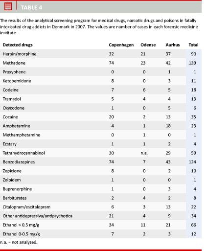 This study evaluated the fatal poisonings among drug addicts in 2007 in Denmark. Cases were examined at the three forensic medicine institutes of Copenhagen, Aarhus and Odense. The data were compared with earlier studies from 1991, 1997 and 2002 [3-5]. As in the former studies, 2007 data were included in a common Nordic study of fatal poisonings among drug addicts [6]. A broad toxicological screening for drugs was carried out to elucidate any poly-drug abuse.