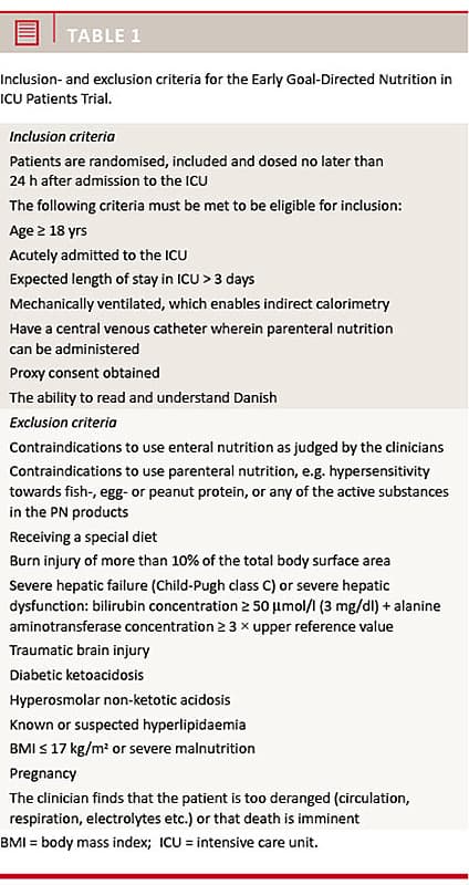 Therefore, in the present study, patients will be randomised to either standard nutritional therapy or early goal-directed nutrition. The early goal-directed nutrition therapy focuses on both energy and protein, including measured requirements (indirect calorimetry and nitrogen balance) and early initiation of supplementary PN to meet 100% of requirements from day 1 after randomisation.