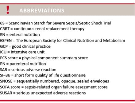 Perner A, Haase N, Guttormsen AB et al. Hydroxyethyl starch 130/0.42 versus Ringer’s acetate in severe sepsis. N Engl J Med 2012;367:124-34.