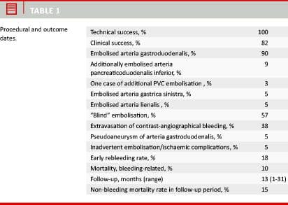 Upper gastrointestinal (GI) bleeding is defined as bleeding proximal to the ligament of Treitz. Upper GI bleeding has a mortality of approximately 10% [1]. Patients most commonly present with melaena, haematemesis, haematochezia and/or shock [2]. Duodenal and gastric ulcers are the most common reasons for bleeding in adults, followed by tumor and pancreatitis [3]. In most cases (80%), bleeding ceases spontaneously or after therapeutic endoscopy, which is the first-line therapeutic intervention [4]. If therapeutic endoscopy fails, the secondary therapeutic options are surgical or interventional radiological procedures. Surgical intervention is associated with a high mortality reaching 30% in patients with severe comorbidity [4, 5]. We retrospectively analyzed the efficacy and safety of intraarterial embolisation with coils after failed endoscopic therapy in patients with upper GI bleeding.