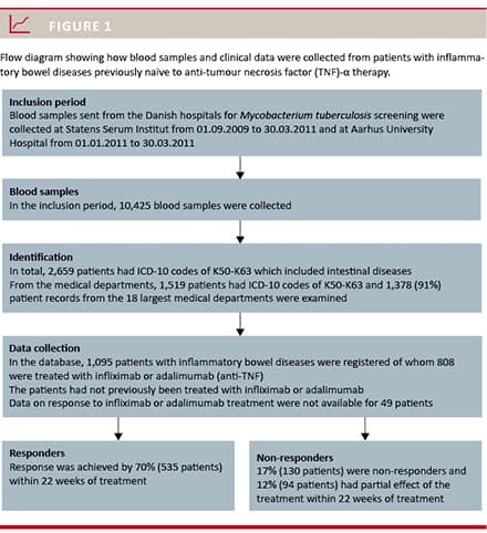 Methods: A national, clinically based cohort of previously naïve anti-TNF treated patients from 18 medical departments was established. The patients were screened for tuberculosis prior to treatment initiation. By combining the unique personal identification number of Danish citizens (the CPR number) from blood samples with data from the National Patient Registry, patients with International Classification of Diseases, Version 10 (ICD-10) codes K50-K63 were identified. Treatment efficacy reflected the maximum response within 22 weeks.