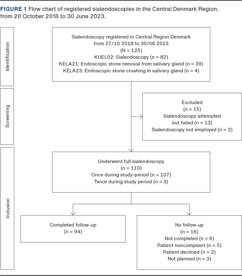 A total of 125 procedures were identified based on procedure codes. Fifteen were excluded due to failed attempts of sialendoscopy (n = 13) or being coded with the wrong procedure code (n = 2). Thus, 110 complete sial endoscopies were performed in the study period, as presented in Figure 1. Sixteen cases were lost to follow-up. Three individuals underwent sialendoscopy twice during the study period, leaving 91 unique patients with follow-up. Patient demographics are presented in Table 1.