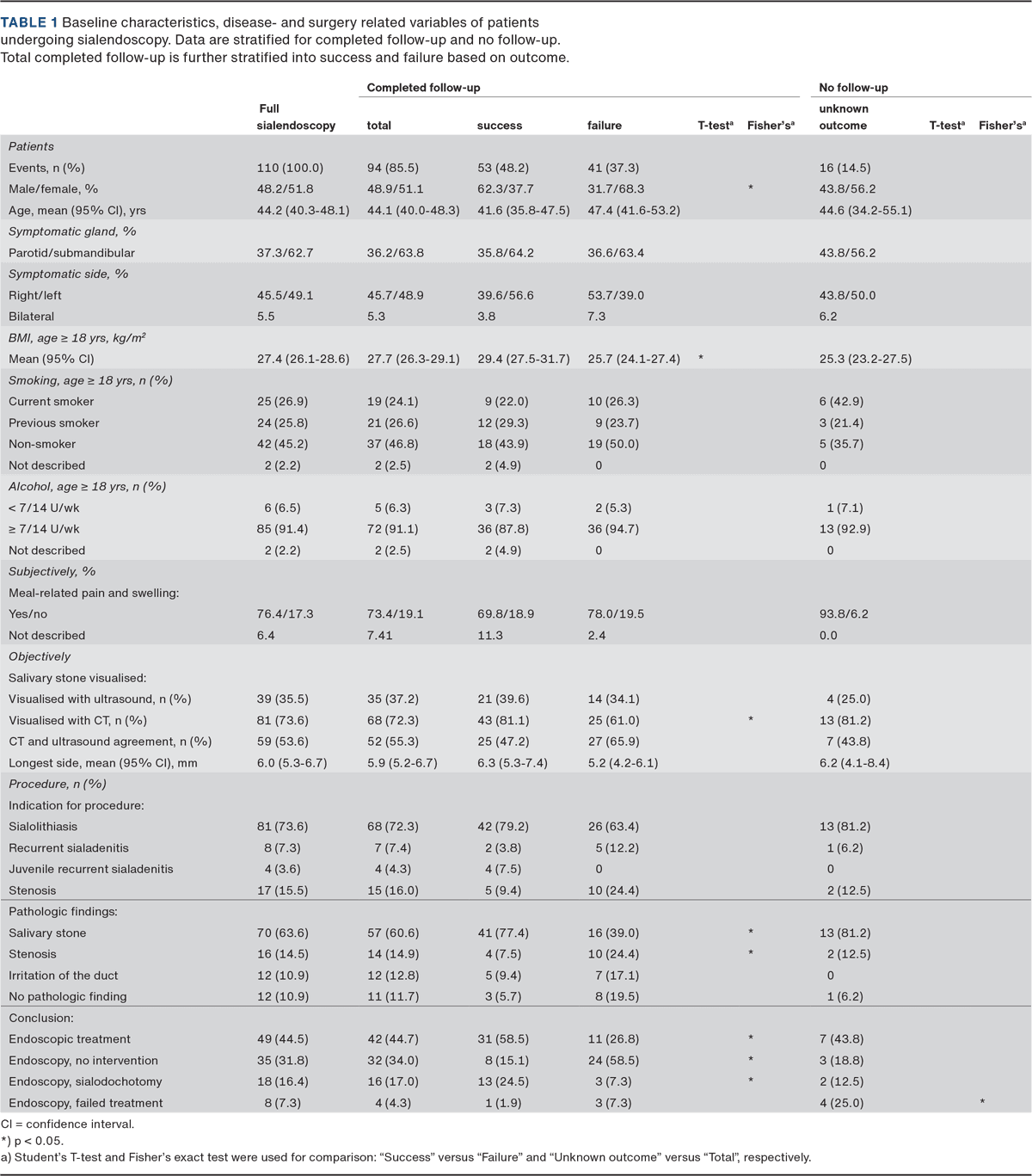 RESULTS. Complete sialendoscopy was performed in 110 patients of whom 94 attended a follow-up after three months. The mean age at the time of surgery was 44.2 years (95% confidence intervals (CI): 40.3-48.1), and 48.2% were male. Surgical success was achieved in 53 cases with follow-up (56.4% (95% CI: 46.4-66.4%)). Additionally, symptom relief was achieved in another 23 cases, meaning that a total of 76 patients benefited from the procedure (80.9% (95% CI: 72.9-88.8)). Patients with sialolithiasis had a significantly higher surgical success rate, while patients with stenosis had a significantly lower surgical success rate.