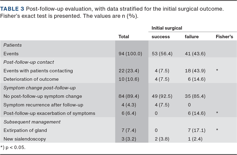 The secondary outcome encompassed the long-term outcome beyond the three-month follow-up until 25 October 2023. Secondary outcomes were either no change since follow-up, symptom recurrence, exacerbation of symptoms, gland extirpation or a new sial endoscopic procedure.