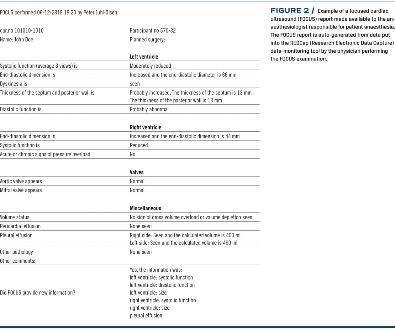 FOCUS follows the principle formulated in the focused assessed transthoracic echocardiography (FATE) protocol [8]. In short, FOCUS provides information on cardiac status and pleural effusion by the following views: Apical four-chamber view, apical five-chamber view, parasternal long-axis view, parasternal short-axis view, subcostal four-chamber and inferior vena cava view, and bilateral pleural views. See Figure 1 for examples of normal anatomy and common pathology. Two-dimensional grey-scale cine loops are stored from each view and the data extracted are fed into the web-based REDCap (Research Electronic Data Capture) data capture tool [17]. The data extracted are based on visual evaluation of cine loops including eye-balling, simple calibration and M-mode. Activation of Doppler modalities are not allowed. The data from each view are synthesised to automatically generate a FOCUS report that is made available to the anaesthesiologist ultimately responsible for providing anaesthesia to the patient. Please see Figure 2 for a FOCUS report example. The report contains information on: