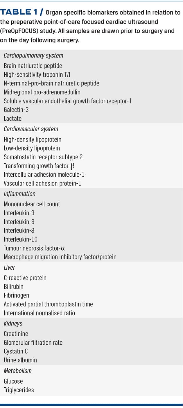 To describe whether the conjunctional use of FOCUS and biomarkers of organ function can identify patients at an increased risk of pos-toperative complications (secondary aim), a panel of biomarkers is obtained on the day before surgery and on the first post-operative day. Blood samples are frozen, and pooled analyses of these biomarkers are performed every 12-24 months. Hence, they cannot influence the effects of FOCUS. The biomarkers taken are given in Table 1.