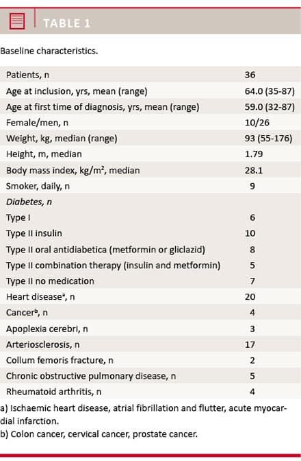 The average age at admission was 64 years (35-87 years). Among the cases 28% were women and 72% were men. Six patients were diagnosed with diabetes mellitus type I, and 30 patients were diagnosed with diabetes mellitus type II. The baseline characteristics of all patients are presented in Table 1.