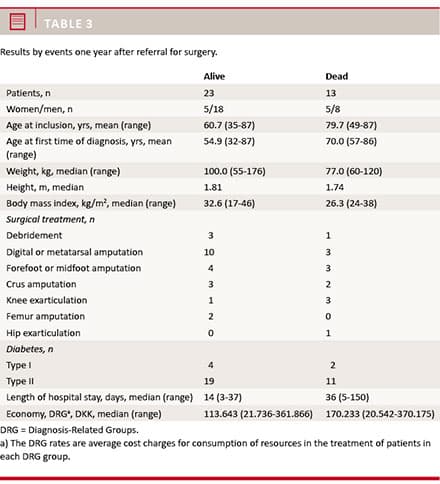 Results: A total of 48 patients were referred for surgical treatment of a diabetic foot ulcer. The average age on admission was 64 years (35-87 years). The median length of hospital stay was 17 days (3-150 days), and 14 patients were readmitted within the first year. Within the first year of enrolment, 13 patients died, corresponding to a 36% mortality rate. Based on the Danish Diagnosis-Related Groups rates, the median cost associated with a case in the study population was 133,867 DKK.
