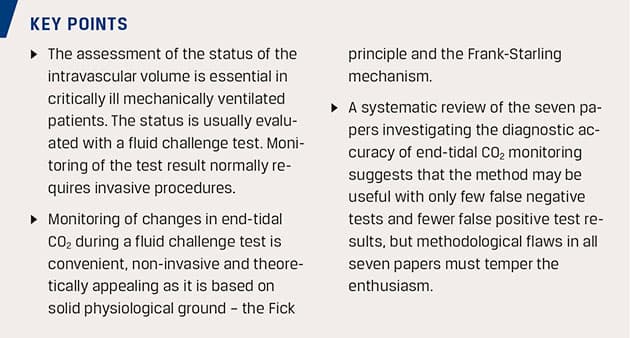 relies on the Frank-Starling mechanism and Fick’s 148-year-old – repeatedly validated – hypothesis that cardiac output can be estimated from the volume of carbon dioxide eliminated through the lungs divided by the difference in carbon dioxide content in mixed venous blood and arterial blood. So, if CO2 production and ventilation are constant, there is no doubt that an increase in preload, causing an increase in cardiac output – and a concomitant decrease in alveolar dead space ventilation – will result in an increase in ET-CO2. But can our standard CO2-monitors reliably detect the small increase in ET-CO2 that is to be expected, considering the limited increase in cardiac output seen after a passive leg raising manoeuvre (PLR) or volume infusion?
