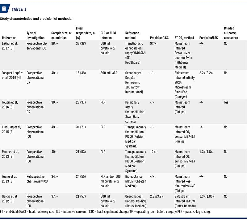 Post hoc calculations (by the authors of the included papers) indicated that an increase in ET-CO2 of 2 mmHg (5%) or more was diagnostic of fluid responsiveness. None of the seven studies were industry sponsored or initiated, and none of the scientists involved in the studies reported having relevant conflicts of interest. No patient harm was inflicted by the performance of the index or reference methods.