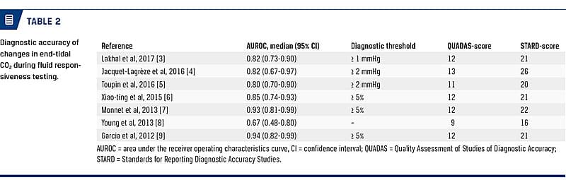 Titles and abstracts of papers found in the databases were read by all authors. Papers reporting on the sensitivity, specificity and/or the area under the receiver operating characteristics curve (AUROC) of changes in ET-CO2 during volume responsiveness testing were selected for further analysis.