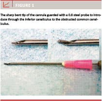 In cases with proximal stenosis, sharp dissection of the common canaliculus was performed with a bent tip of an 18G 40 mm cannula. The sharp tip of the cannula was guarded with a 0.8 steel probe and introduced through the inferior canaliculus to the obstructed common canaliculus. The cannula was then advanced over the steel probe to dissect and remove the obstruction in the common canaliculus entering the saccus, Figure 1.