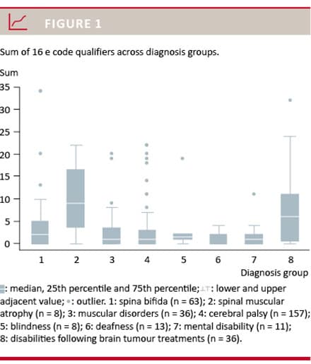 The sum of e code qualifiers across diagnosis groups showed a greater spread among children with more complex disabilities, demonstrating a more diverse set of environmental demands in daily living (Figure 1).