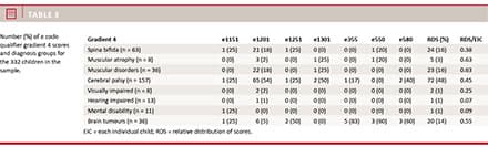 The relative distribution of qualifier-4 scores was calculated as average and percentage and further related to each individual child within the respective disability.