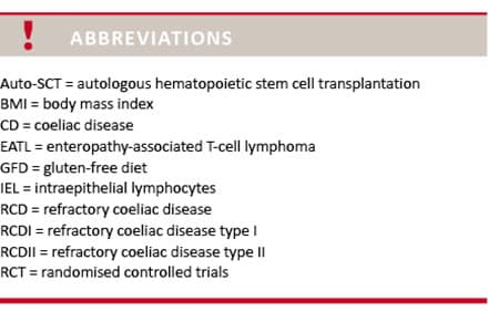 In most cases, a missing response to GFD is due to poor adherence [5]. However, a small group of CD patients are resistant to GFD due to refractory coeliac disease (RCD) [6]. According to the Oslo definitions, RCD is defined as persistent or recurrent malabsorptive symptoms and signs of villous atrophy despite a strict GFD for more than 12 months, or severe persistent symptoms independently of the duration of GFD [4].