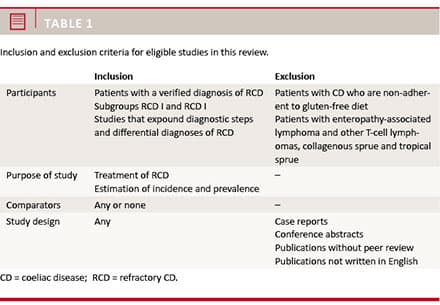 After removal of duplicates, the abstracts were screened according to the inclusion and exclusion criteria. The present evidence on incidence, prevalence and treatment for RCD is limited, and no randomised controlled trials were available. Therefore, there was no restriction on sample size or study design except for case reports and case series, which were excluded. The definite inclusion and exclusion criteria for eligible studies are listed in Table 1. To see the selection process, please refer to the flow chart, Figure 1. From the 20 full-text articles, seven full-text articles were excluded for various reasons, e.g. not mentioning that the study was based on a case series in the abstract, not explaining diagnostic methods and not adequately diagnosing RCD. Finally, another reason for exclusion was an outcome focused on pathological and immunological mechanism rather than having a clinical response as the main outcome in the cases in which this was not mentioned in the abstract of the articles.
