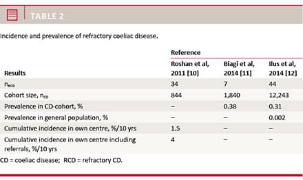 The accurate prevalence and incidence of RCD remain unknown. The literature on the epidemiology of RCD is scarce and limited to a few studies from tertiary referral centres. Most patients with RCD are referred to large tertiary centres and an unavoidable selection bias emerges. Therefore, the results must be interpreted with caution. The selection bias is due to the high number of RCD patients in tertiary centres, which do not