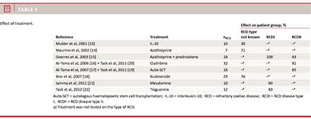 In this review, evidence for treatment of RCD is based mainly on prospective or retrospective open-label clinical trials without any control group. There are no randomised clinical trials. The different RCD treatments can be classified into four different groups: steroids, immunosupressants, chemotherapy and bone marrow transplantation. Steroids have long been used for symptom management in RCDI and RCDII causing side effects and severe steroid-dependency, i.e. the patients cannot withdraw from steroids without RCD relapse [2, 6, 7].
