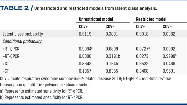 We first used unrestricted LCA to differentiate between two latent classes: I) “COV+” with characteristic (highly probable) COVID-19 patients and II) “COV–” with non-COVID-19 individuals. In the optimal scenario, we would expect the latent class “COV+” to include truly infected persons (concomitant positive RT-qPCR and chest CT), whereas “COV–” would include truly uninfected persons (concomitant negative RT-qPCR and chest CT). The choice of a model with two latent classes was based on a comparison of the AIC, showing potential overfit of a model with a higher number of classes (AIC of ten for three vs four for two latent classes). Recalling the aforementioned definitions of sensitivity and specificity, the conditional probability of a positive RT-qPCR test within the latent class “COV+” (π(RT-qPCR+│COV+])) would serve as an estimate of the sensitivity for the RT-qPCR test, whereas the conditional probability of a negative RT-qPCR within the latent class of “COV–” (π(RT-qPCR│COV–])) is an estimate of its specificity.
