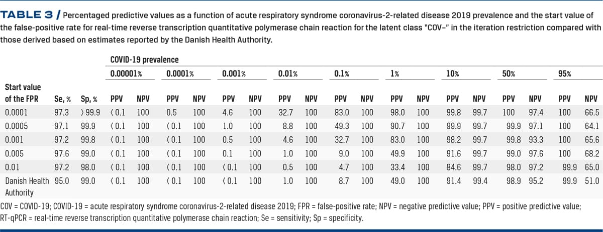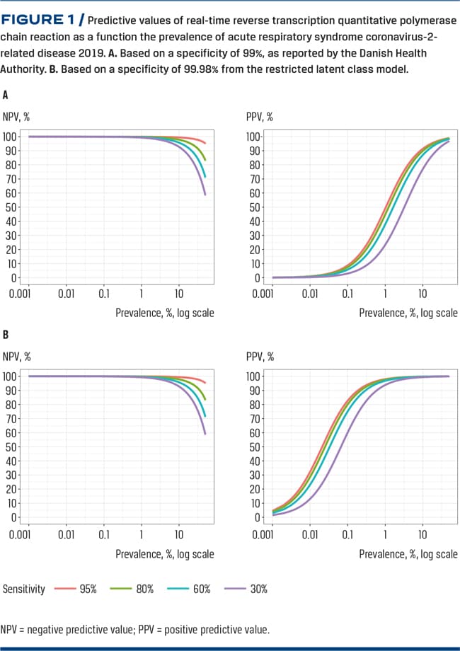 We used the sensitivity and specificity for RT-qPCR obtained from the LCA to estimate predictive values by COVID-19 prevalence and compared them with values from the main analysis. Of note, we had originally based all plots on our LCA. However, because of concerns about vulnerable model definitions with only two variables and because new data on the sensitivity and specificity of RT-qPCR emerged during the review process, we based the final plots on the performance estimates from the Danish Health Authority.