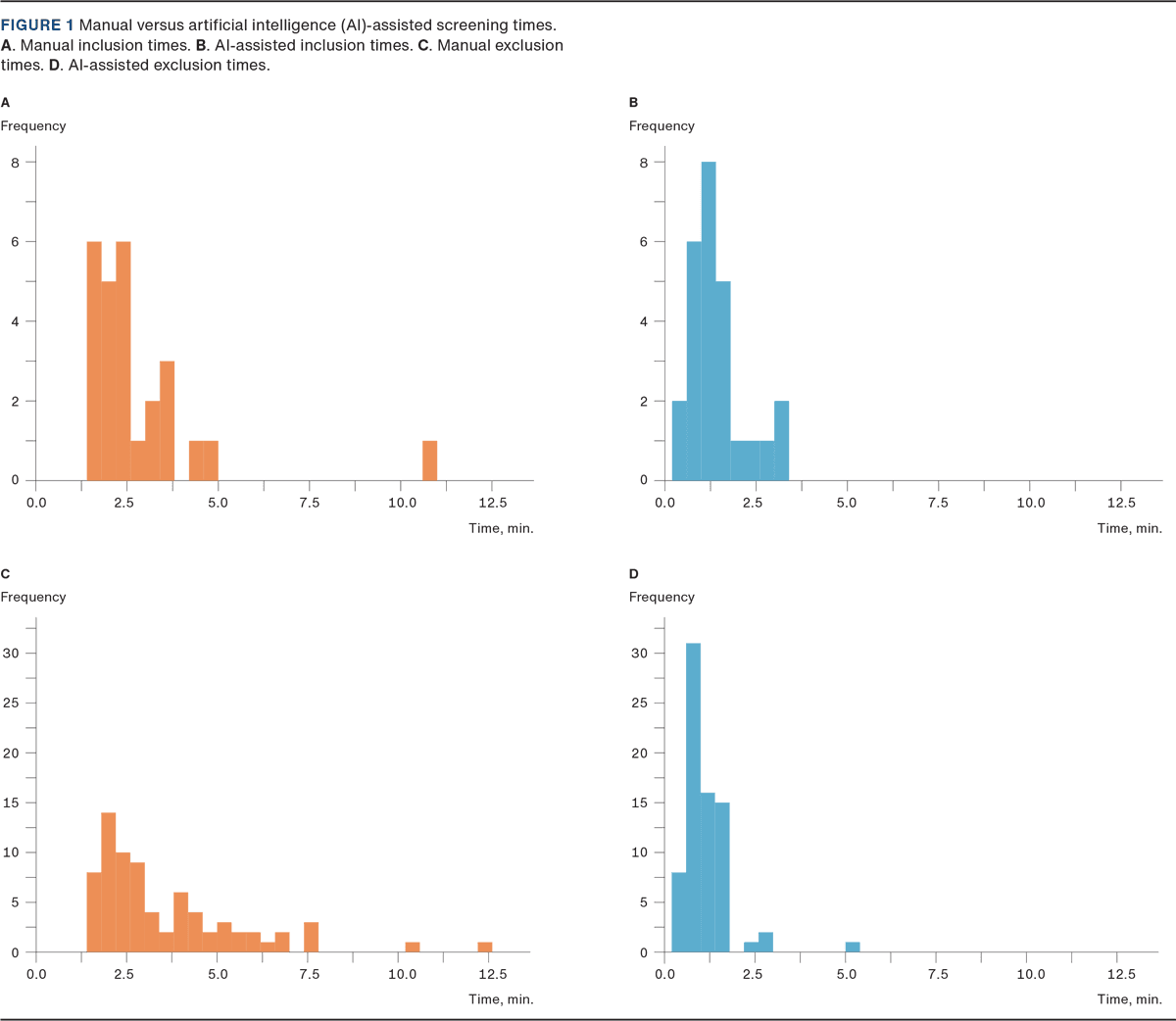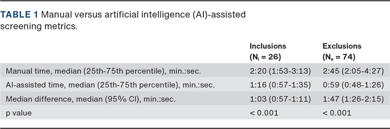 RESULTS. AI-assisted chart review identified the same 26 AMICS patients as manual review (Cohen’s kappa = 1). Median manual inclusion time was 2:20 minutes, compared with 1:16 minutes with AI-assisted chart review (p < 0.001). Median manual exclusion time was 2:45 minutes, and AI-assisted exclusion was 0:59 minutes (p < 0.001).