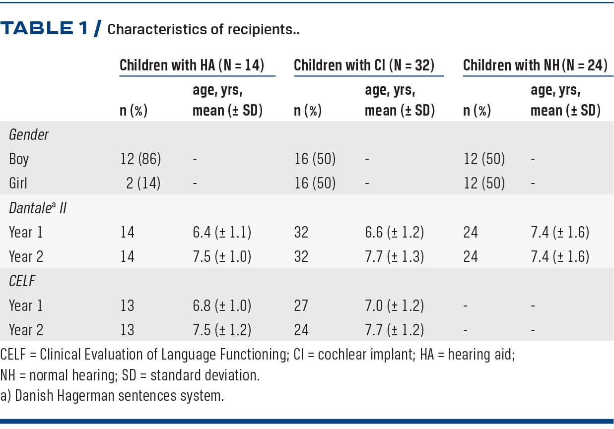 The present study is part of a larger project “IHEAR – in school with hearing impairment” with the overall vision: No child with HI left behind. This vision is understood in broad terms and incorporates areas of audition/listening, speech, language, cognition and social well-being. The research unit of Decibel [10] is the principal investigator of the project and works in partnerships with Oticon/Oticon Medical, Rigshospitalet, Aarhus University Hospital and the Capital Region of Denmark. The primary aim of the present study was to investigate whether children with normal hearing (NH) and HI can perform the speech recognition test Dantale II – a Danish sentence-based test of speech perception – in noise. Dantale II is a well-known clinical tool in Denmark but is seldomly used for paediatric populations, even though the original study stressed that Dantale II can be used with children who are able to memorize five-word sentences [4]. A secondary aim was to identify differences and similarities between children with NH/HI and between children with HA/CI and track developments over a two-year period. Furthermore, the study investigated possible associations between Dantale II and verbal working memory, as