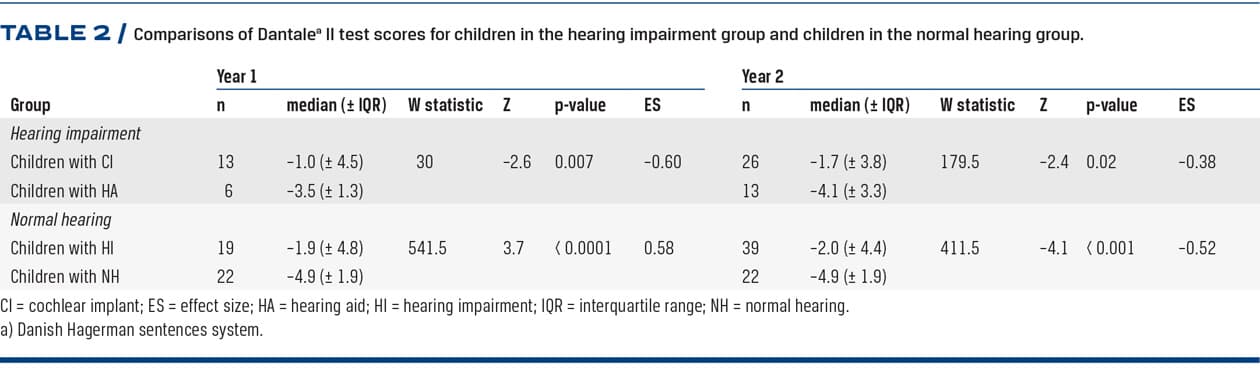 Children with HA outperformed children with CI at a significant level both years, p = 0.007 and p = 0.02, respectively. The NH group significantly outperformed the HI group in both years: Year one (W = 541.5, Z = 3.7, p < 0.0001), year two W = 411.5, Z = –4.1, p < 0.01).