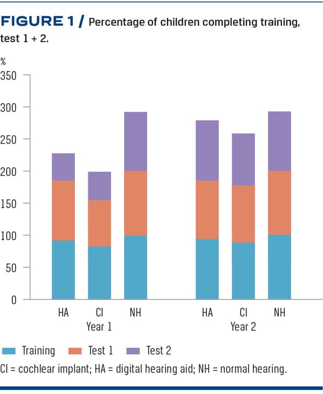 Table 1 summarises characteristics of recipients in terms of age at test, gender and hearing technology. Table 2 summarises test statistics, p-values and effect sizes. Figure 1 summarises the percentage of completion of training and test 1 + 2. At year one, the percentage of children with HA/CI who completed test 2 was lower than that of children with NH, 42%, 44% and 92% respectively. At year two, markedly more children with HA/CI completed test 1 + 2, 93%, 81%, and 92%, respectively. Two-sample t-tests revealed that children who did not complete both tests at year one and two were significantly younger (year one: t = –4.0, n = 46, p = 0.0002) and (year two: t = –2.0, n = 46, p = 0.05).
