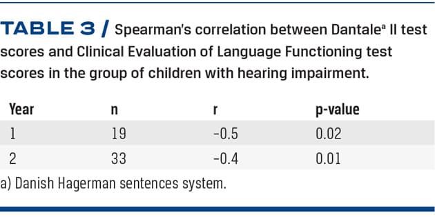 Table 3 summarises the results of the CELF-4 compared to Dantale II. Results of the Spearman’s correlation indicated a significant and moderately strong association, e.g. a better score on Dantale II (negative values) was associated with a better score on the CELF-4 for both year one and two: r = –0.5, p = 0,002/r = –0.4, p = 0.001, respectively.